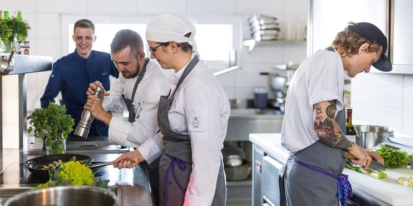 We are a great team, and each of us knows what the other does best. Marc is a passionate chef and the head of the kitchen. He brings his knowledge from around the world into our cuisine. You will find Mara both in service and at the reception. As a sommelier, she is happy to assist you with wine recommendations. Together with Marlene, they are the hosts of the Weisses Kreuz – always present but never intrusive. Marlene is also a little mountain princess – she accompanies our guests on foot or by bike and gives excellent mountain tips. Thomas, on the other hand, prefers to stay in the background. The garden and the technical maintenance of the house are his domain. He also drives our guests through the beautiful Obervinschgau region with our hotel shuttle.