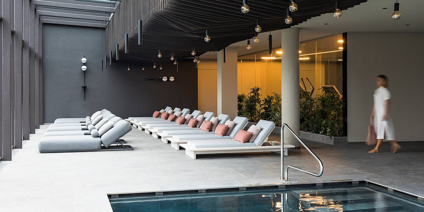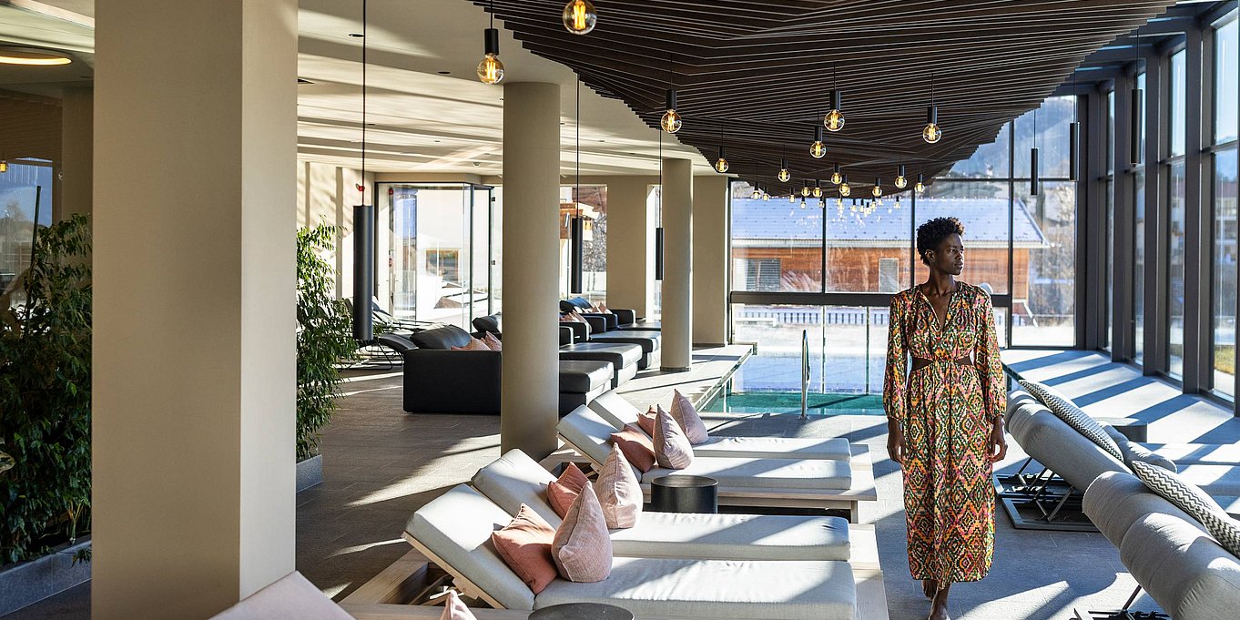 The Aura mea adults-only spa in South Tyrol is a place where you're free to simply be. Where time doesn't matter; where you can take a break from day-to-day cares. Elegant forms, clear lines, muted colours and fine materials from the local environment lend our spa, Aura mea ,a particularly peaceful, harmonious atmosphere. We had our spa in South Tyrol built with Sarner Porphyry, an especially beautiful quartz rock. That is our tribute to nature. Because that's what surrounds, invigorates and inspires us. In this special environment, the stresses and strains of everyday life melt away of their own accord. Feel how everything begins to flow and simple things offer the greatest happiness: Gently massaging hands. Invigorating waters. Tingling heat. Mountain vistas