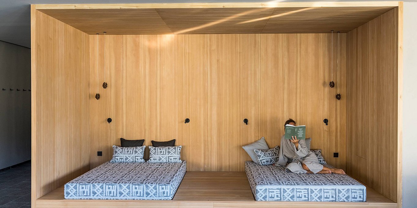 Suffused with radiant light, our Aura mea panoramic relaxation room opens up new perspectives. A breath-taking panorama is spread out before you. The view stretches from the summit of Piz Lun across to the vineyards of the Marienberg monastery. Behind that lies the eternal ice of the glacier. Send your soul on a journey. Let your body unwind on exquisitely comfortable loungers. The Silence Lounge in our SPA in South Tyrol is a place of secure contentment. Your mind is enveloped in soothing silence like a cocoon. The comforting dimness is broken only by soft candlelight. Three pleasantly warm waterbeds offer ample room for beautiful dreams and gentle slumber. The Aura mea Relaxlounge is a place for unadulterated relaxation. Cuddle up with one of your favourite people on the comfortable double loungers Enjoy reading a book under one of our reading lamps. Or listen to the soothing water fountain. The beautiful wooden wall could tell thousands of stories. Hundreds of years ago, it was part of a Venosta Valley farmhouse.